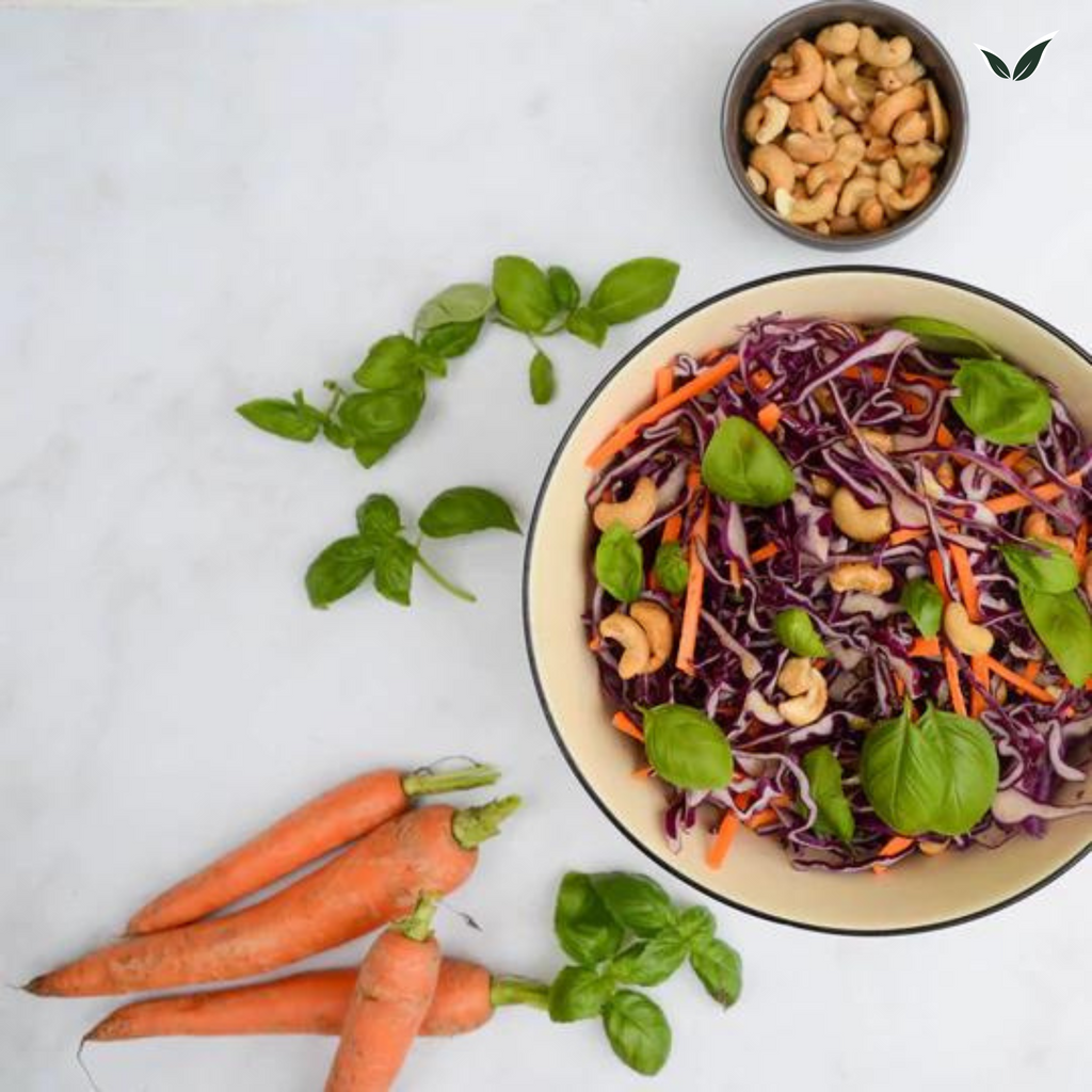 Salade de choux rouges aux carottes aux noix de cajou et au basilic