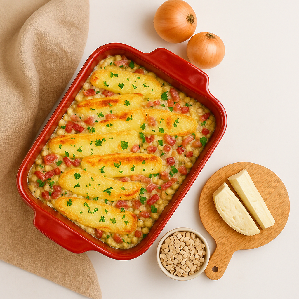 Crozet*, reblochon*, crème fraiche*, crème liquide*, lardon, oignon, ail, gingembre, vin blanc*, thym, laurier, salade composée, huile d'olive, moutarde*, vinaigre balsamique*.