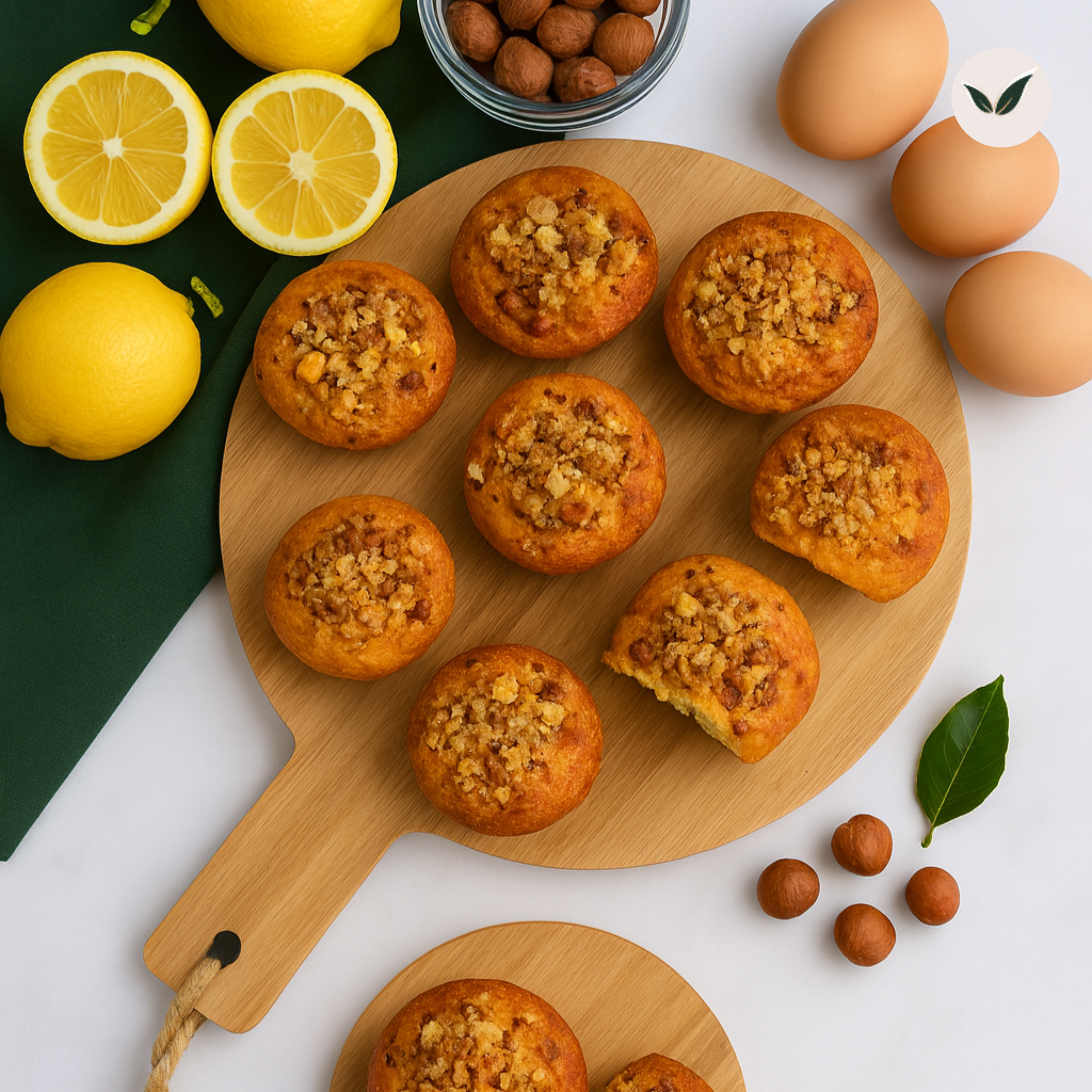 Farine*, beurre*, œuf*, sucre, poudre de noisette*, citron, noisette*, levure chimique*, crème liquide*.