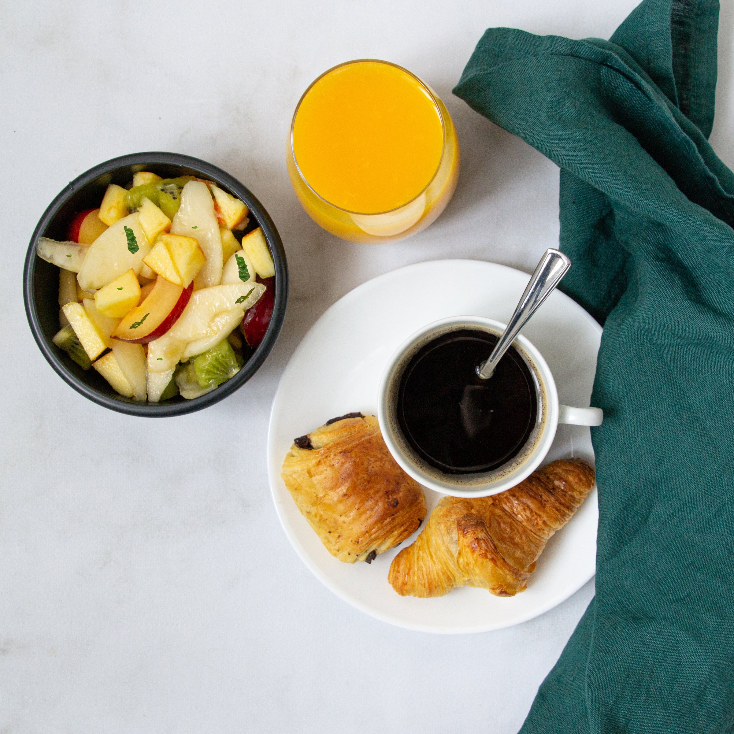ll est composé d'un jus de fruits artisanal, de deux mini-viennoiseries ainsi que d'une salade de fruits de saison.