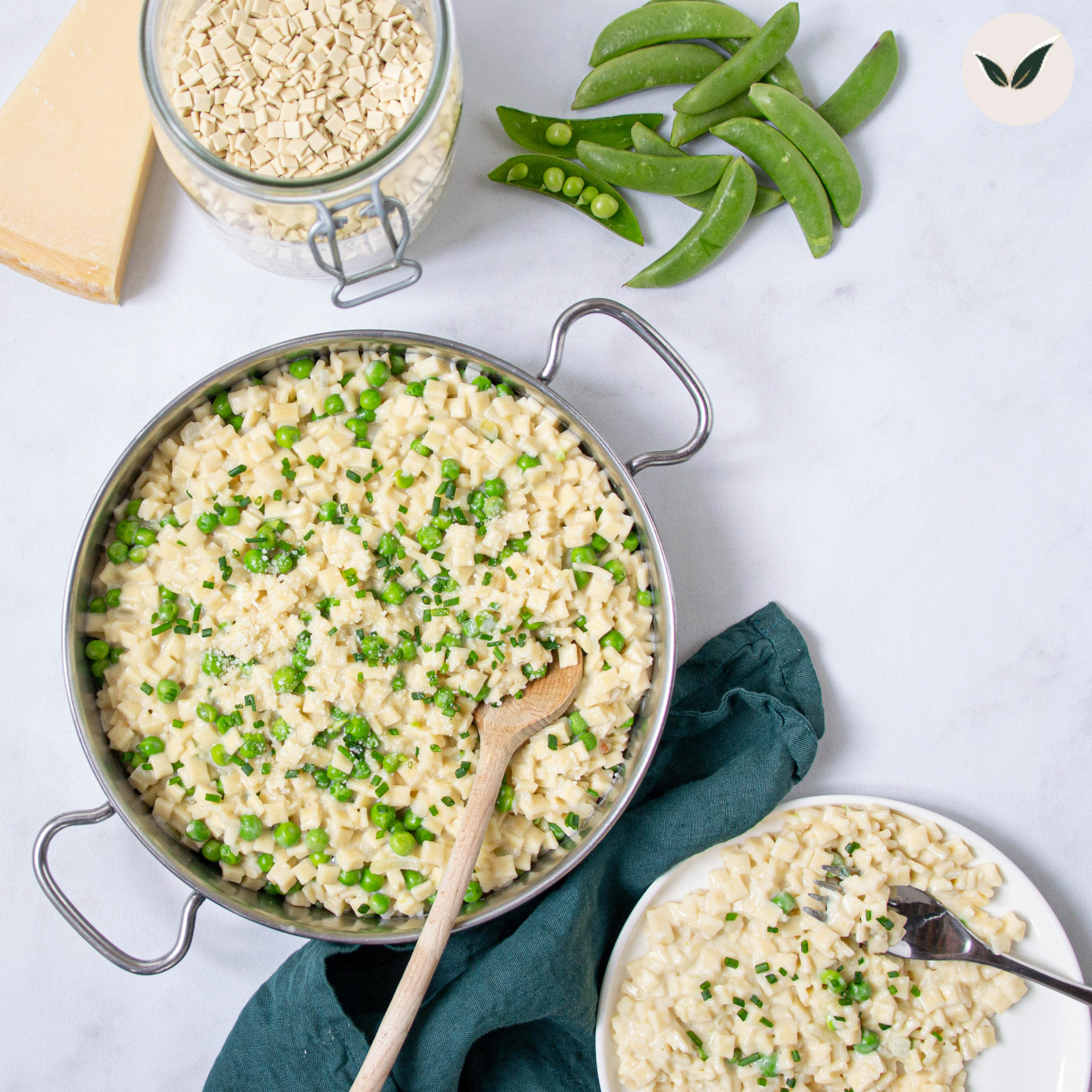 Crozet*, petit pois, oignon, vin blanc*, beurre*, mascarpone*, bouillon de légumes, parmesan*, herbes aromatiques fraîches, salade composée, huile d'olive, moutarde à l'ancienne*, vinaigre balsamique*, sel, poivre.
