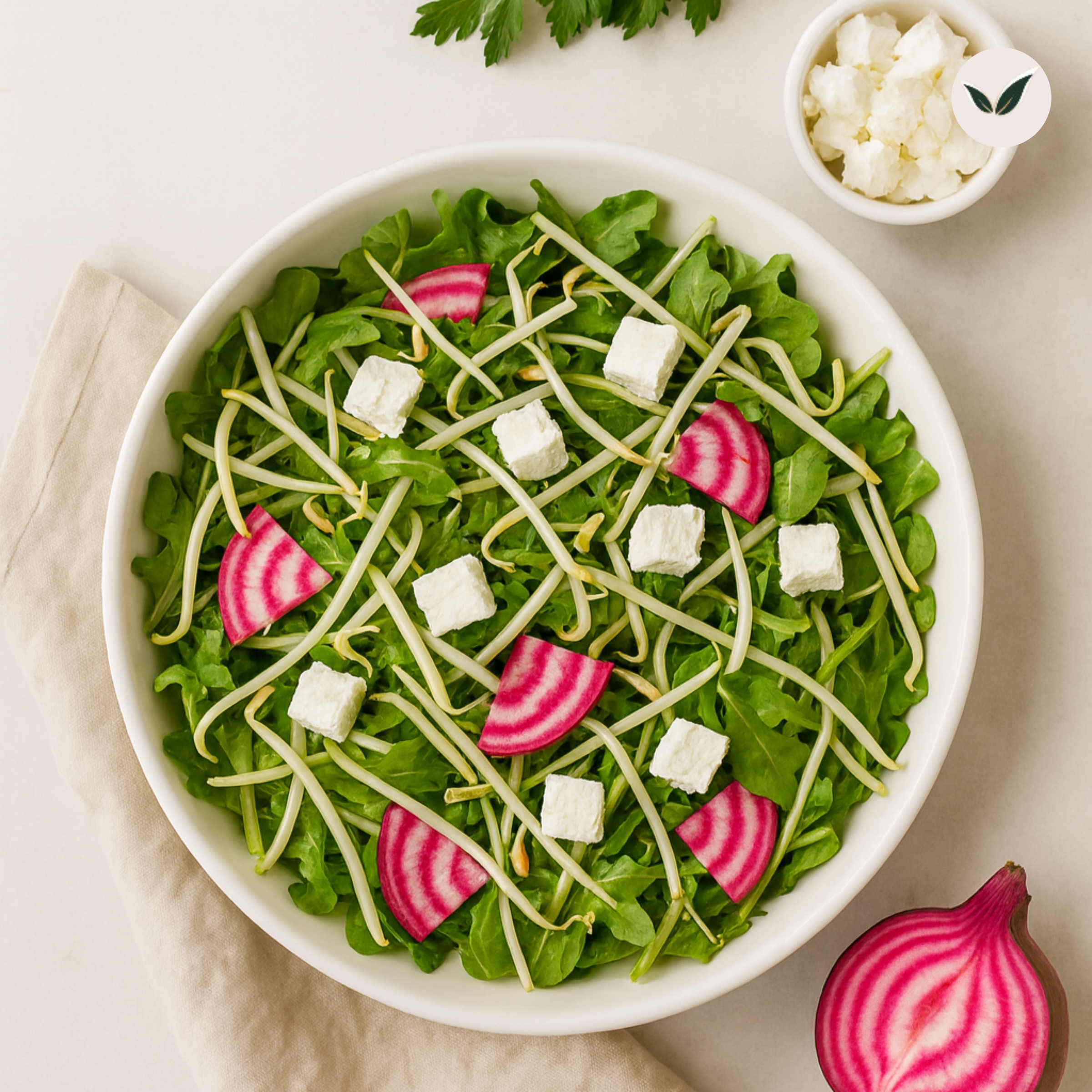 Betterave chioggia, pousse d'épinard, feta*, pousse de soja*, moutarde à l'ancienne*, vinaigre balsamique*, huile d'olive, sel, poivre.